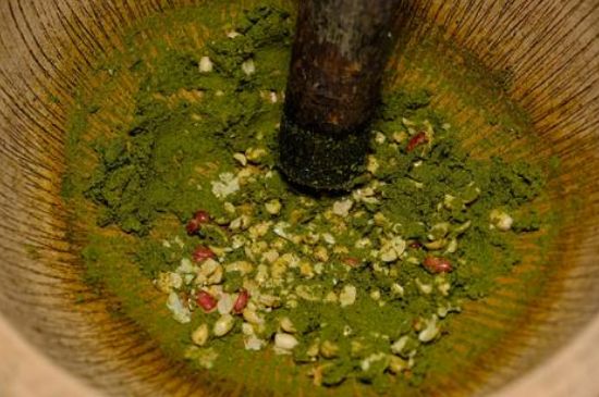 3、揉捻:双手握叶成团,顺时针方向旋转团揉,先轻后重,揉至叶卷成条,白霜显露即可。