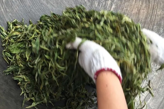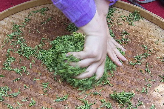 揉茶是为了使茶叶易于冲泡, 将炒过的茶叶以操捻的方式使其卷曲,同时也利用压力使茶叶的汁液渗出并附在茶叶上,让茶香更容易释出。操作过程中需不时烘焙茶叶,然后进行压缩轮压,反复三次,促使茶叶的条形结实,颜色变暗绿。