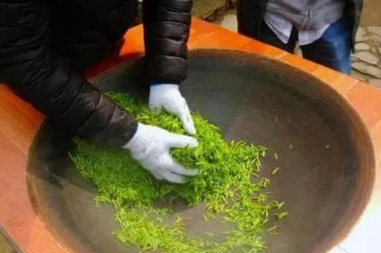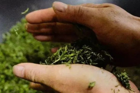 边炒边用双手用力地将全部茶叶,揉搓成数个小团,不时抖散,反复多次,搓至条形卷曲,茸毫显露。