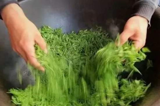在平锅内或斜锅内进行 当锅温190~200°C时 投叶500克左右,以抖为主、 双手翻炒 做到捞净、抖散、杀匀、杀透 无红梗无红叶、无烟焦叶历时3-5分钟