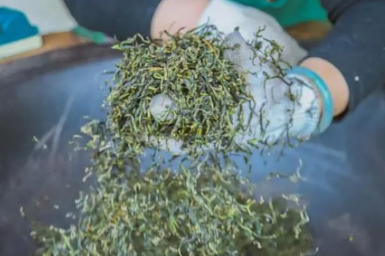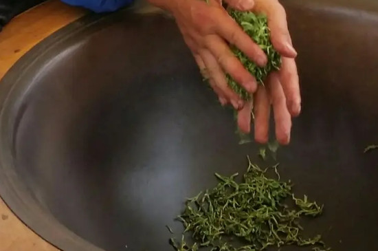 4、揉脸完成以后要让茶叶重新入过,这时铁锅的温度要控制在80-90度之间,然后把茶叶入锅慢慢翻炒,大约三四十分钟就能把茶叶炒干这时鲜嫩的茶叶就已经炒出锅以后降温就能用来泡水喝。