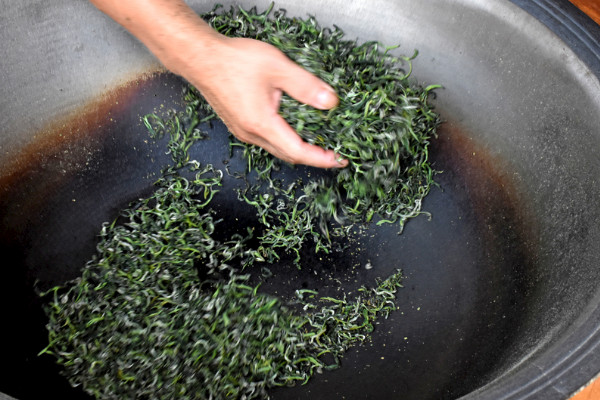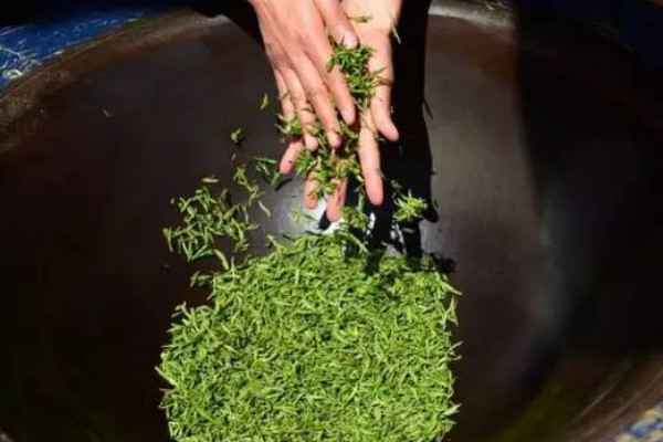 锅烧热之后,把采摘好的新鲜茶芽倒入锅中,火候调成小火,用双手开始来回翻炒,炒茶的动作一定要快,以免茶叶的边缘被炒焦,尽量不要用工具翻炒,使用工具不能很好的掌握力度,因此会破坏茶叶的完整性,翻炒期间时不时抖散茶叶。