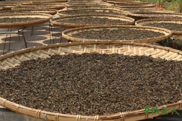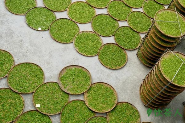 将按照大小区分好的绿茶均匀的铺在容器上摊平晾晒,摊晾的主要目的是减少鲜嫩茶芽中的水分,厚度最好在5厘米左右,一定要茶芽在容器中保持平均,每隔2小时翻动一次,最多翻动6小时,此时用手触摸茶叶就能感觉水分已经大量流失。