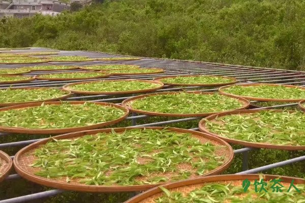 用来制作绿茶的新鲜茶芽进行区分后,将其平铺在准备好的容器上,一定要保证均匀,不要一边过厚一边过薄,放在阳光下进行晾晒,主要目的是挥发茶叶中多余的水分,每隔2小时翻动一次茶叶,翻动5-6次即可,此时茶叶中的水分几乎蒸发30-40%左右。