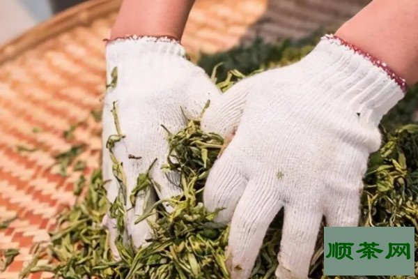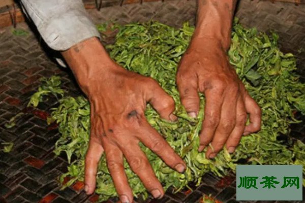普洱茶茶菁后全部取出,等待温度降下来根据茶菁原料老嫩程度进行揉捻,整个揉捻的过程一定要是纯人工进行,做到嫩叶轻揉,老叶重揉,合适的揉捻力度才能更好的为茶叶塑性,揉捻的主要目的是为了把片状茶叶揉捻成条状或圆珠状。