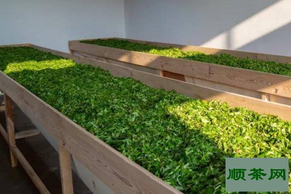 清洗后的鲜叶不能立即开始制茶,将其均匀的摊放在尼龙网或是竹篾上,茶叶摊放的厚度在7-10厘米之间,然后放在阳光下晾晒3-4个小时,晾晒的过程中,为了避免茶叶内部温度过高,每隔一小时就要翻动一次茶叶,晾晒后的茶叶水分出现大部分流失。